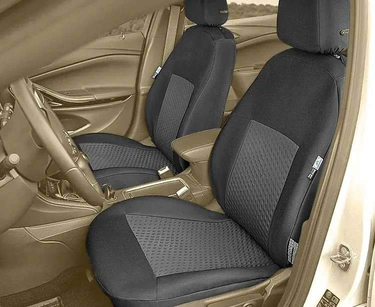 - Pokrowce na przednie fotele składają się z odrębnych części na siedzisko i oparcie i obejmują całe przednie fotele, łącznie z bokami oraz tylną częścią oparcia.