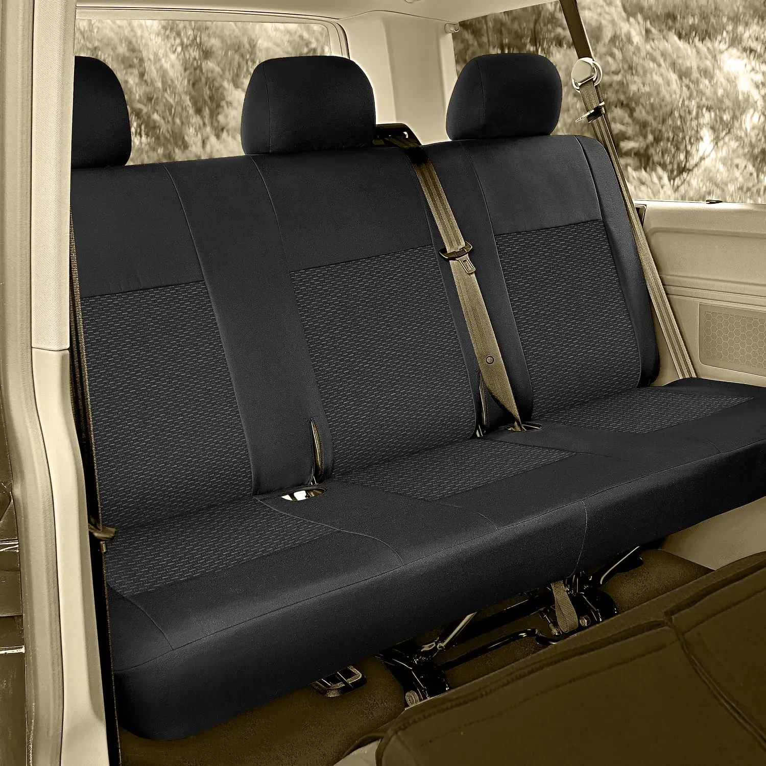 Komplet najwyższej jakości miarowych pokrowców na II lub III rząd do Volkswagena Transportera VW T6 produkowanego od 2015 (wersja 3-osobowa z niedzieloną kanapą). Idealnie dopasowane - zapewniają doskonałą ochronę oryginalnej tapicerki przed zabrudzeniem lub zniszczeniem.